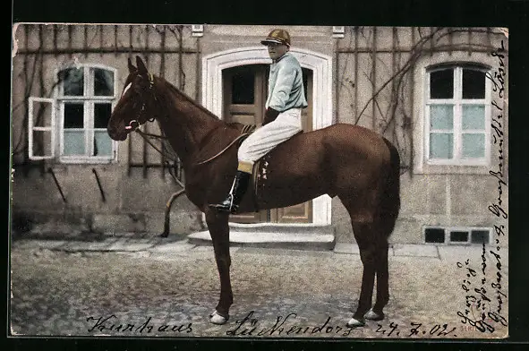 AK Junger Reiter auf seinem Pferd vor einem Haus