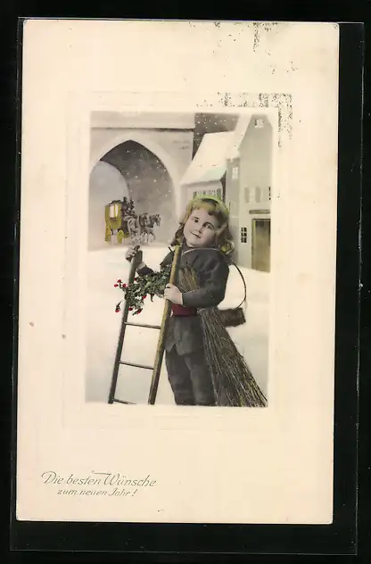 AK Junger Schornsteinfeger vor einer Postkutsche zu Neujahr