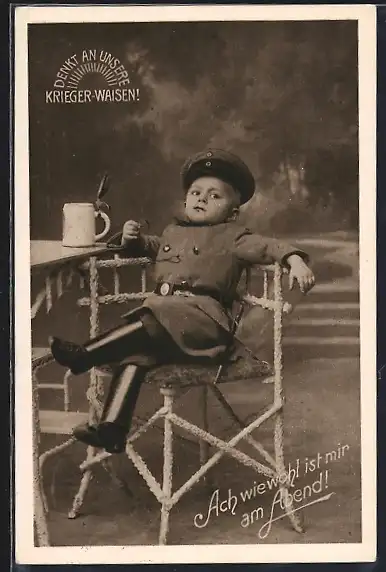 AK Junger Soldat sitzt zum Feierabend am Tisch, Kinder Kriegspropaganda, Denkt an unsere Krieger-Waisen