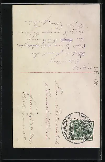 Personenbezogene Daten auf der Rückseite der Karte wurden durch blauen Textmarker unkenntlich gemacht. Die blauen Stellen sind auf die Vorderseite durchgeweicht und wirken sich negativ auf das Postkartenfoto aus