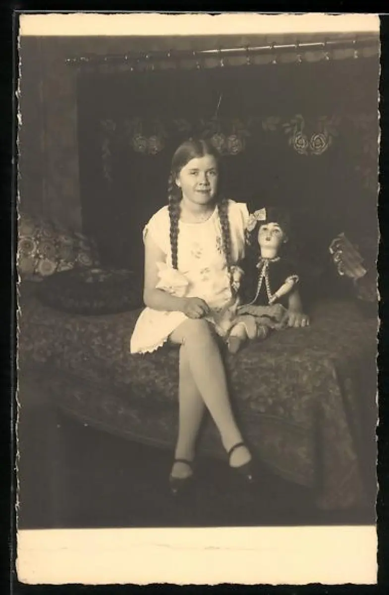 AK Junges Mädchen sitzt mit einer Puppe auf dem Bett