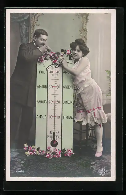 AK Junges Paar an einem Thermometer, Meteorologie