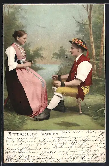 AK Junges Paar in Appenzeller Trachten beim Wolle aufwickeln