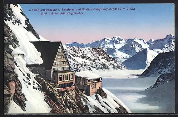 AK Jungfraubahn, Berghaus und Station Jungfraujoch, Blick auf den Aletschgletscher