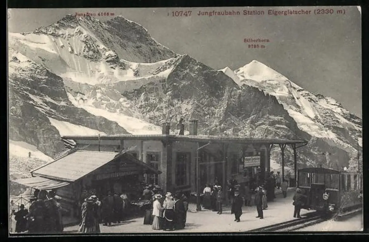 AK Jungfraubahn an der Station Eigergletscher, Fahrgäste auf dem Bahnhof