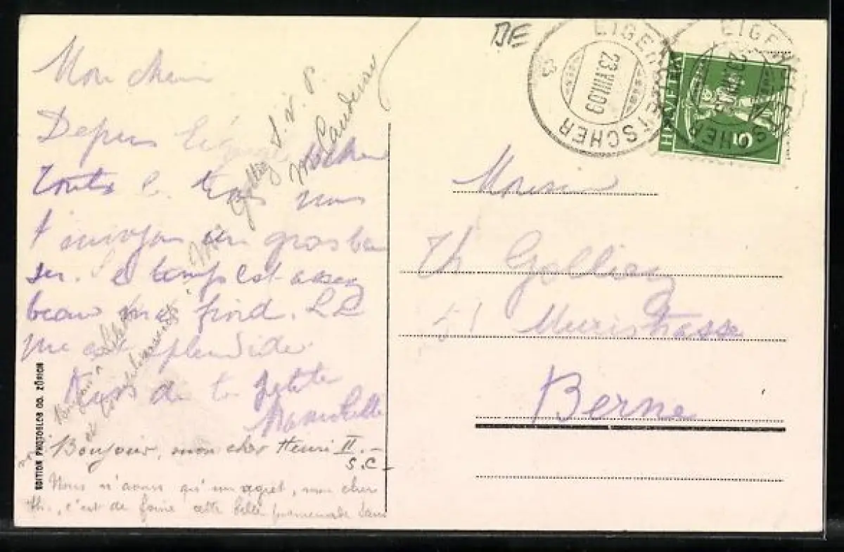 Personenbezogene Daten auf der Rückseite der Karte wurden durch blauen Textmarker unkenntlich gemacht. Die blauen Stellen sind auf die Vorderseite durchgeweicht und wirken sich negativ auf das Postkartenfoto aus