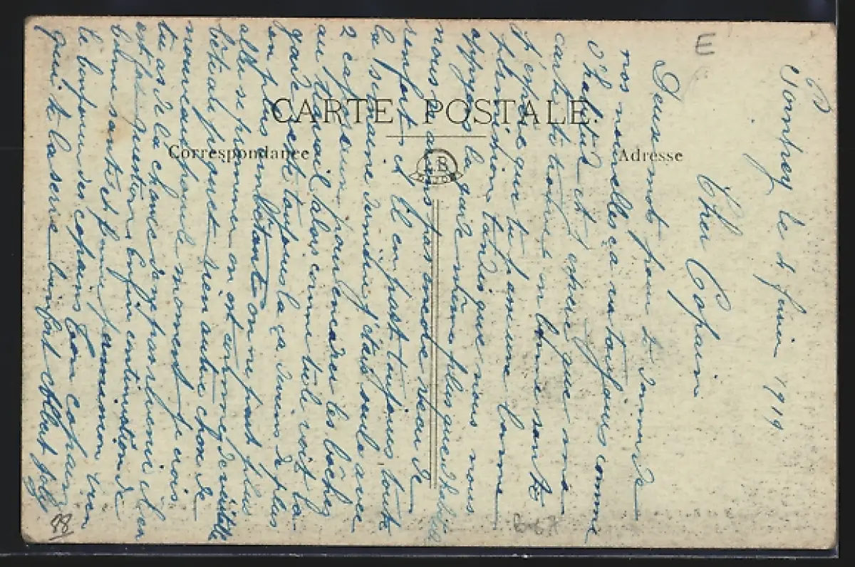 Personenbezogene Daten auf der Rückseite der Karte wurden durch blauen Textmarker unkenntlich gemacht. Die blauen Stellen sind auf die Vorderseite durchgeweicht und wirken sich negativ auf das Postkartenfoto aus