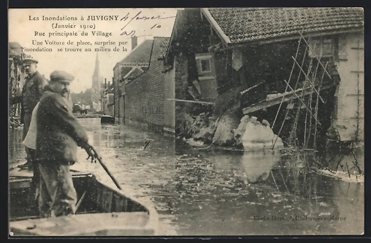 AK Juvigny, Rue principale du Village, inondations avec voiture surprise par l`eau