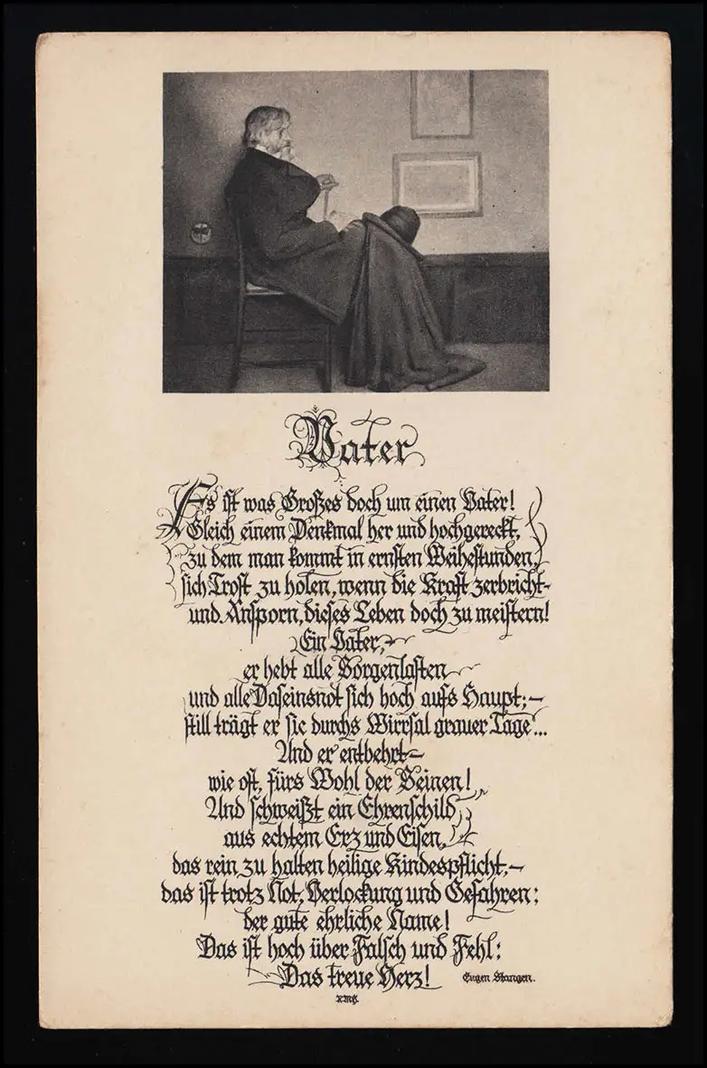 Es ist was großes doch um einen Vater! Gleich einem Denkmal her und hoch gereckt, zu dem man kommt in ernsten Weihestunden, sich Trost zu holen wenn die Kraft zerbricht ..