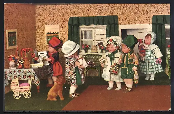 AK Käthe Kruse-Puppen in einer Wohnraum-Szene