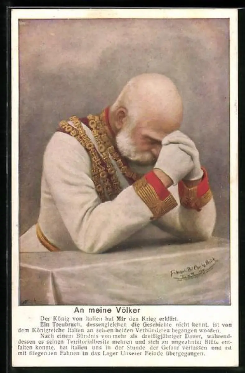 AK Kaiser Franz Josef I. von Österreich in Gedanken an sein Volk nach italienischer Kriegserklärung