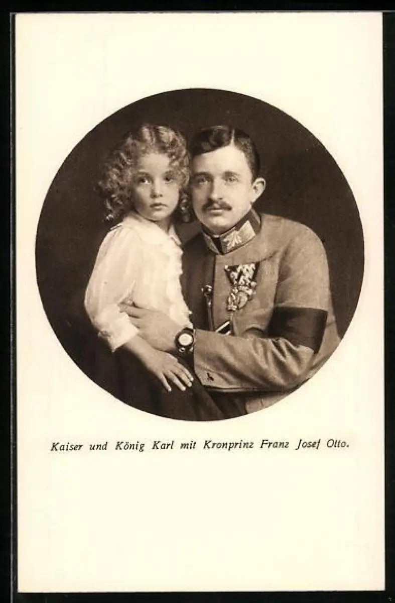 AK Kaiser Karl I. in Uniform mit Orden und Trauerflor und Kronprinz Franz Josef Otto