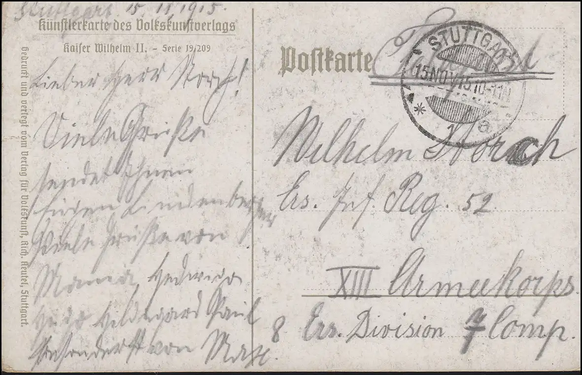 AK Kaiser Wilhelm II. als Feldpostkarte STUTTGART 15.11.1915 an die Front