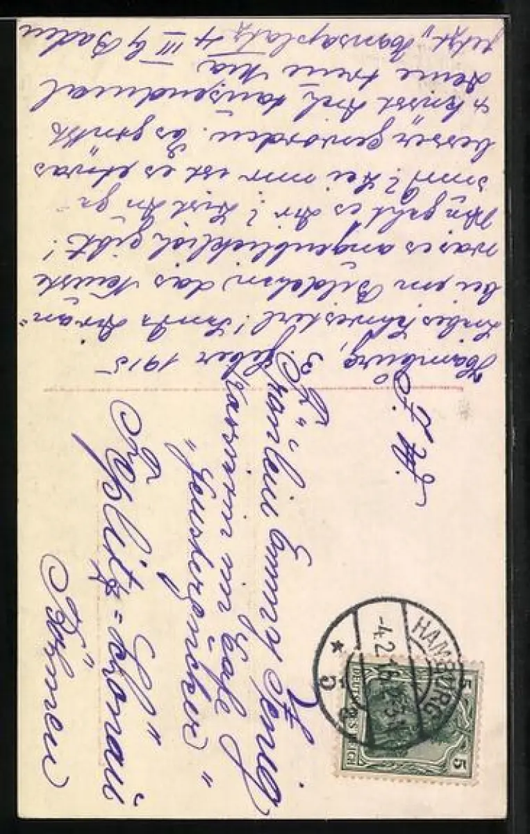 Personenbezogene Daten auf der Rückseite der Karte wurden durch blauen Textmarker unkenntlich gemacht. Die blauen Stellen sind auf die Vorderseite durchgeweicht und wirken sich negativ auf das Postkartenfoto aus