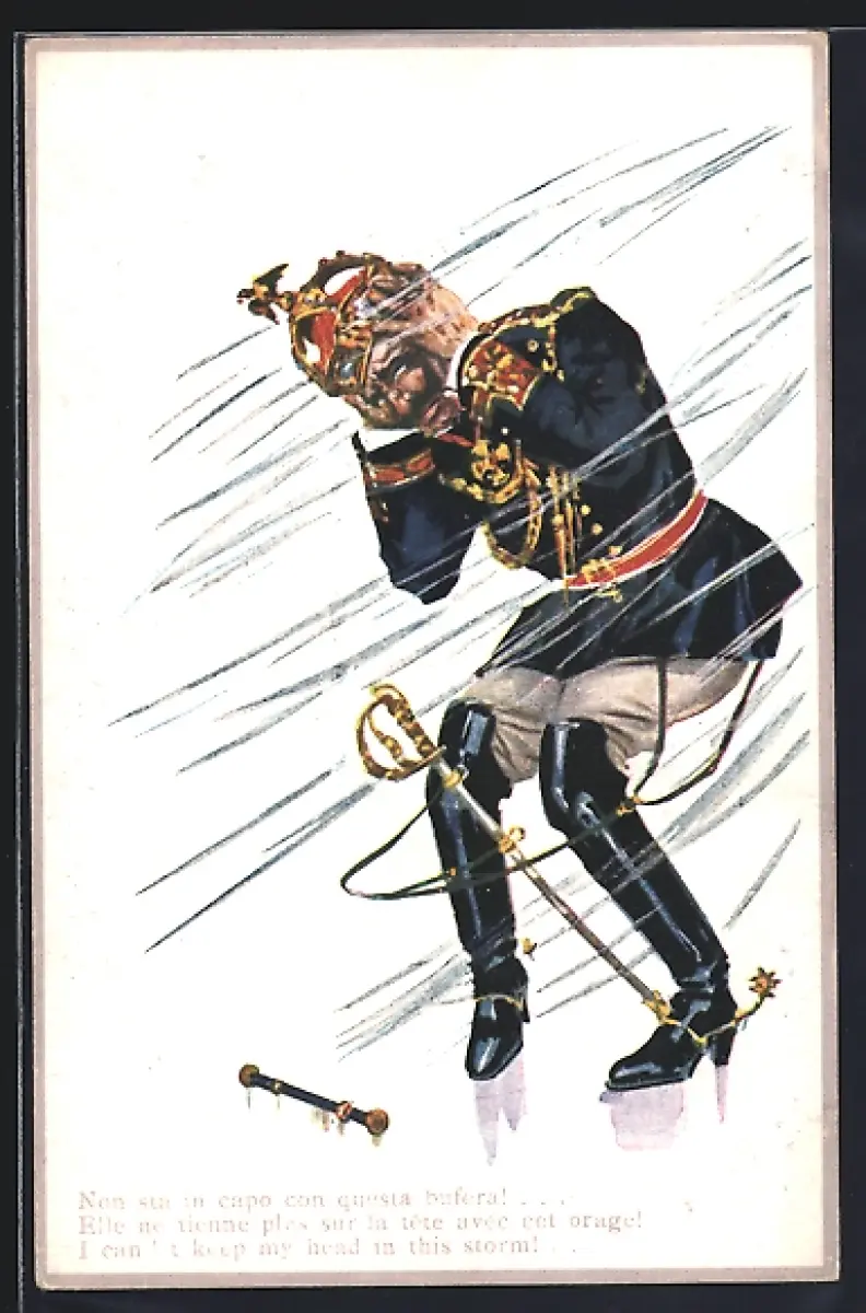 AK Kaiser Wilhelm II. kann seinen Kopf im Sturm nicht halten, Propaganda Entente