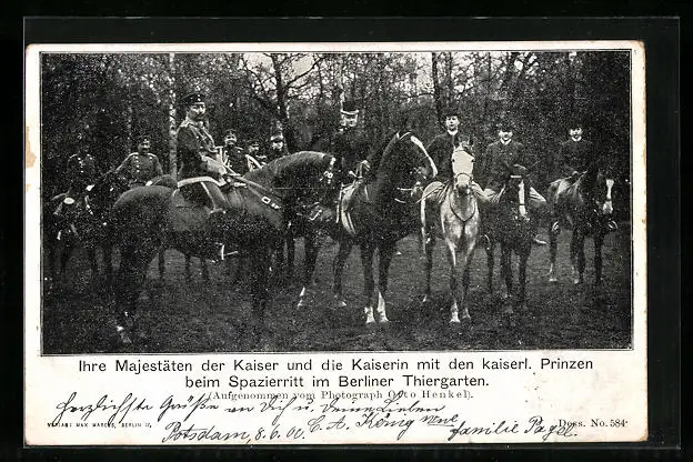 AK Kaiserin Auguste Victoria Königin von Preussen und ihr Gatte mit den Prinzen beim Spazierritt im Berliner Thiergarten