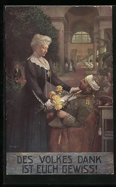 AK Kaiserin Auguste Victoria von Preussen im Lazarett bringt einem Verwundeten Blumen