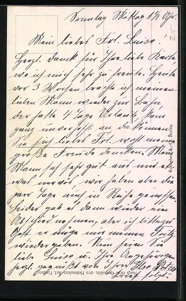 Personenbezogene Daten auf der Rückseite der Karte wurden durch blauen Textmarker unkenntlich gemacht. Die blauen Stellen sind auf die Vorderseite durchgeweicht und wirken sich negativ auf das Postkartenfoto aus