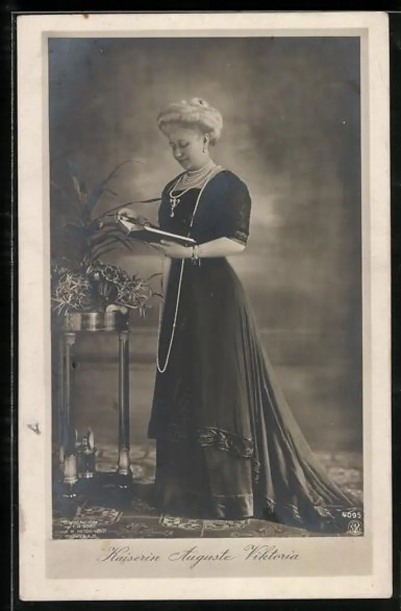 AK Kaiserin Auguste Victoria von Preussen mit Buch, stehend, lange Perlenkette