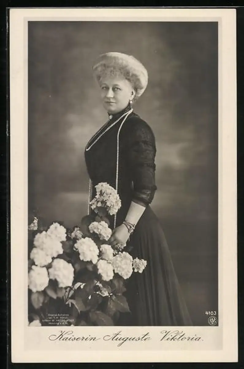 AK Kaiserin Auguste Victoria von Preussen mit Perlenkette und Blumen