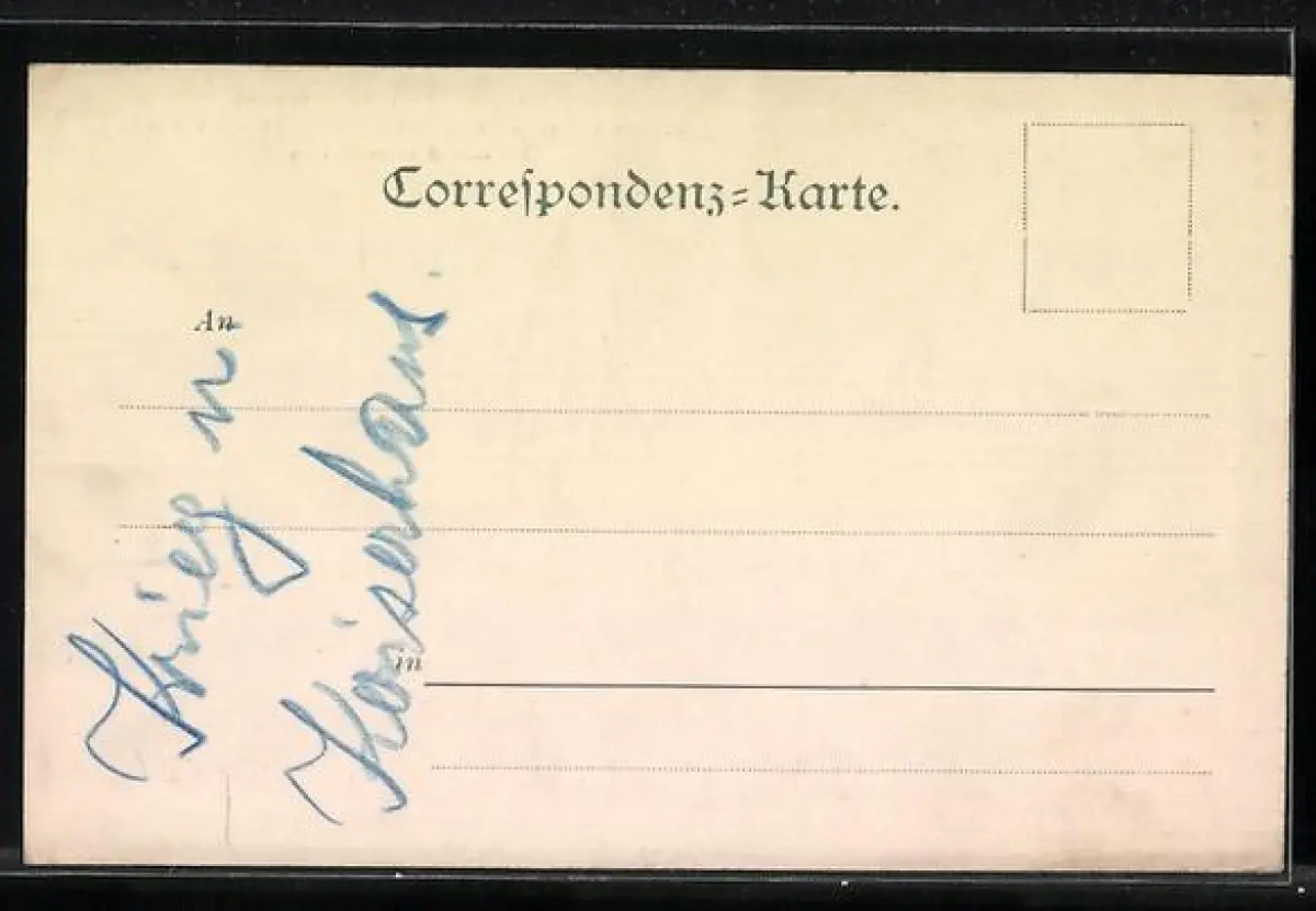 Personenbezogene Daten auf der Rückseite der Karte wurden durch blauen Textmarker unkenntlich gemacht. Die blauen Stellen sind auf die Vorderseite durchgeweicht und wirken sich negativ auf das Postkartenfoto aus