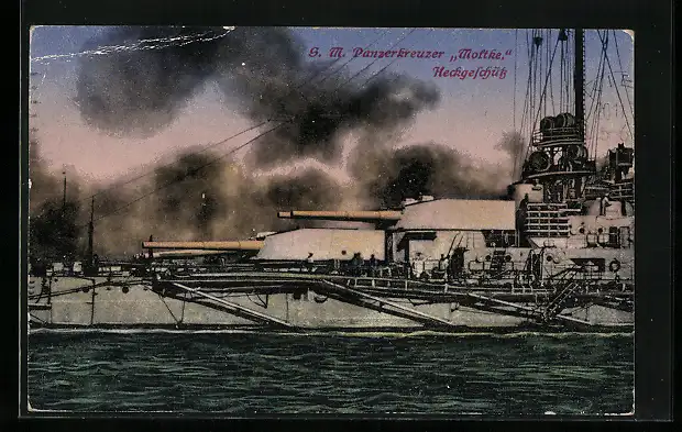 AK Kaiserliche Marine, Kriegsschiff S.M. Panzerkreuzer Moltke, Heckgeschütze werden auf Feind gerichtet