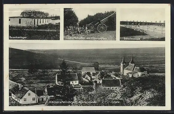 AK Kaisersteinbruch, Barackenlager, Scharfschiessen am Übungsplatz, Schwimmbad, Totalansicht