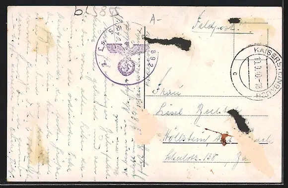 gelaufen 1940, rückseitig Klebe- und Papierreste, rückseitig Oberflächenschaden