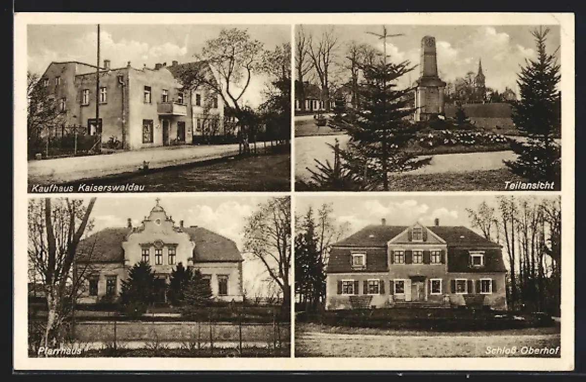 AK Kaiserswaldau, Kaufhaus, Pfarrhaus, Schloss Oberhof und Denkmal