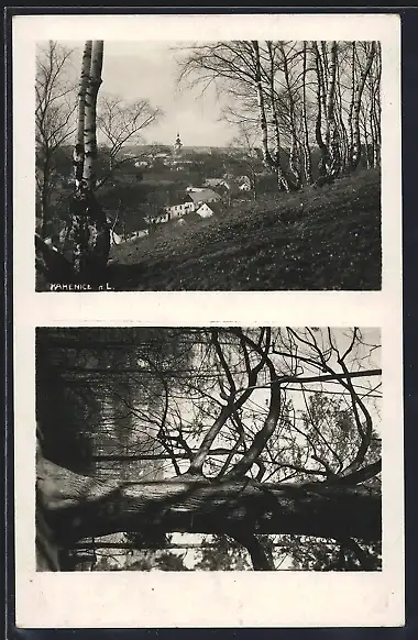 AK Kamenice n. L., Ortsansicht von einem Abhang, Gewässerpartie