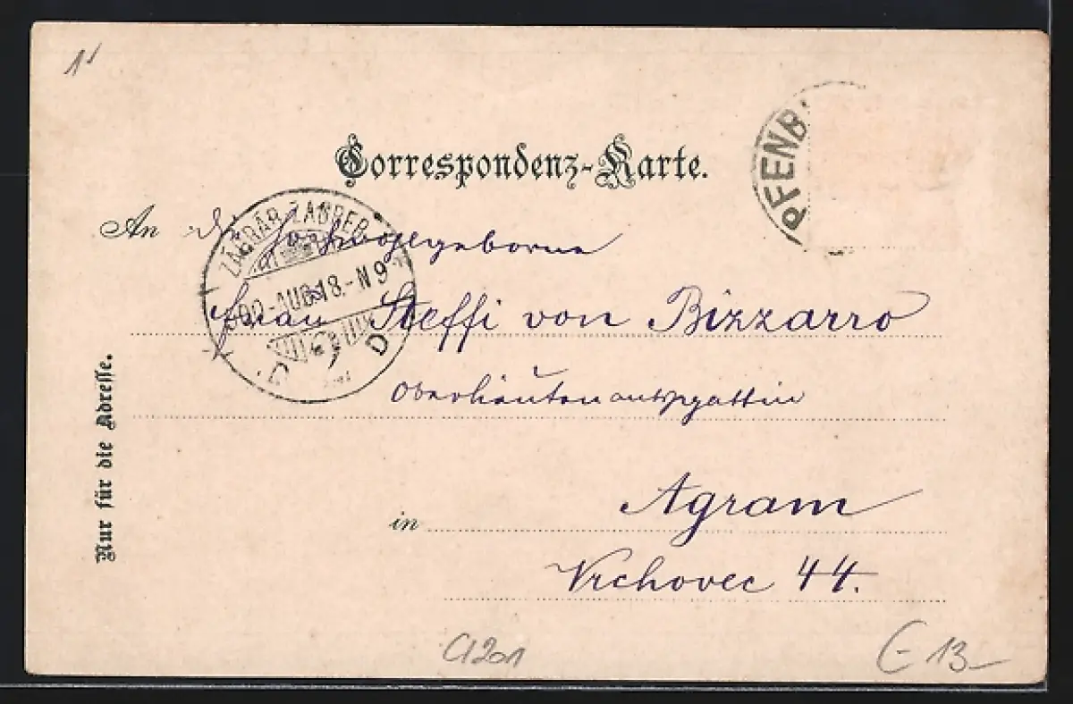 gelaufen 1900, Briefmarke entfernt, Eckknick oben li., Abriebspur oben Mitte u. li., guter Zustand