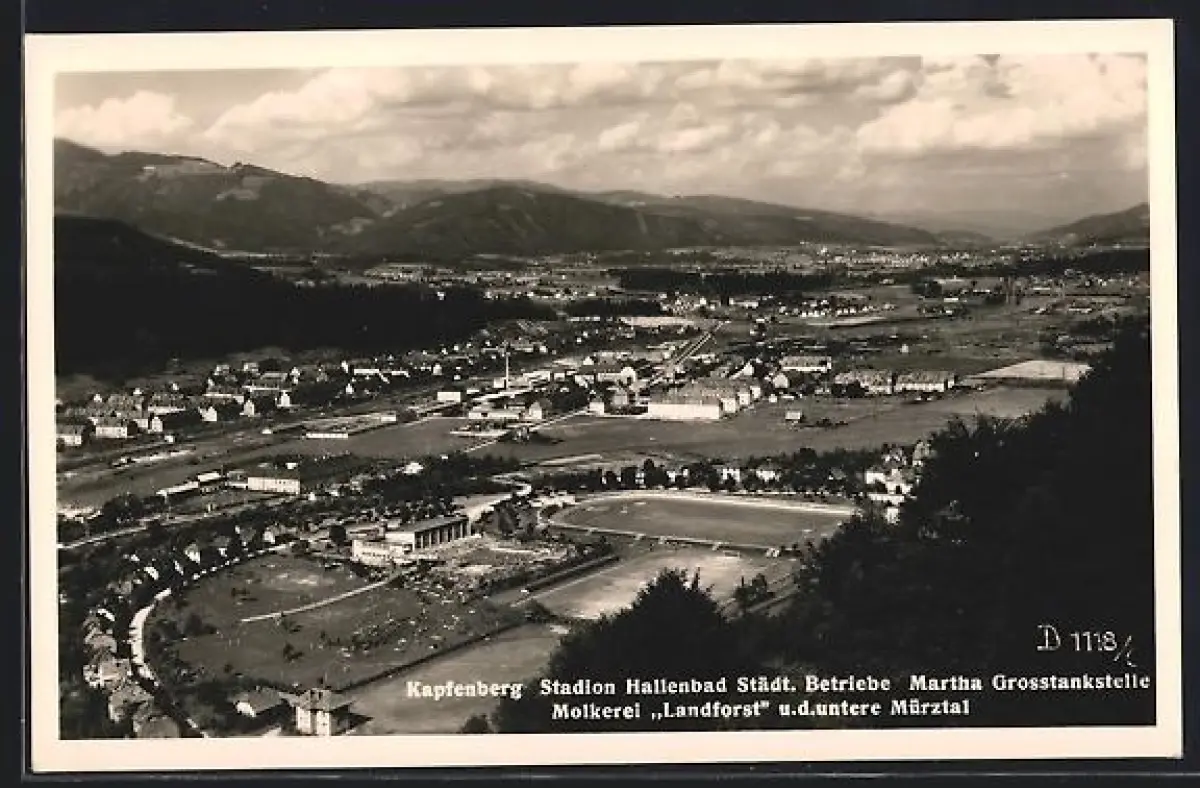 AK Kapfenberg, Stadion Hallenbad Städt. Betriebe Martha Grosstankstelle Molkerei Landforst u. d. untere Mürztal