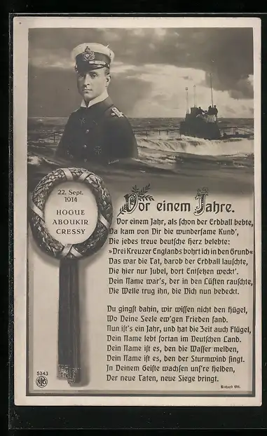 AK Kapitänleutnant Otto Weddigen mit seinem U9 U-Boot bei der Zerstörung der engl. Schiffe Hogue, Aboukir und Cressy