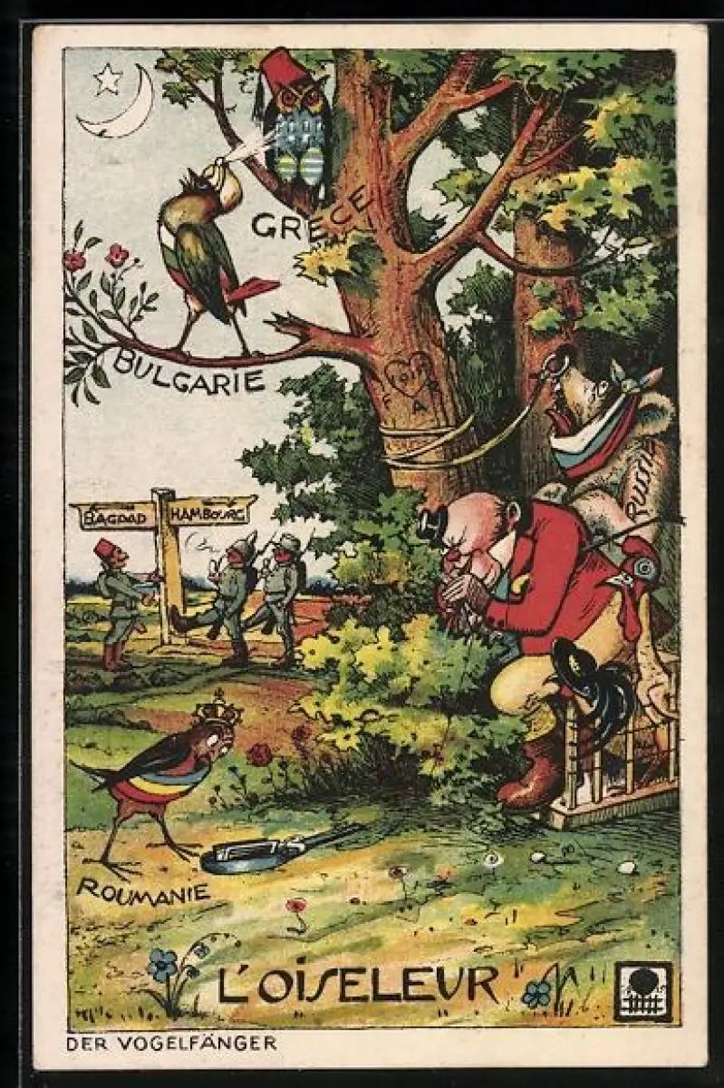 AK Karikatur: Engländer versucht als Vogelfänger andere Völker zu fangen
