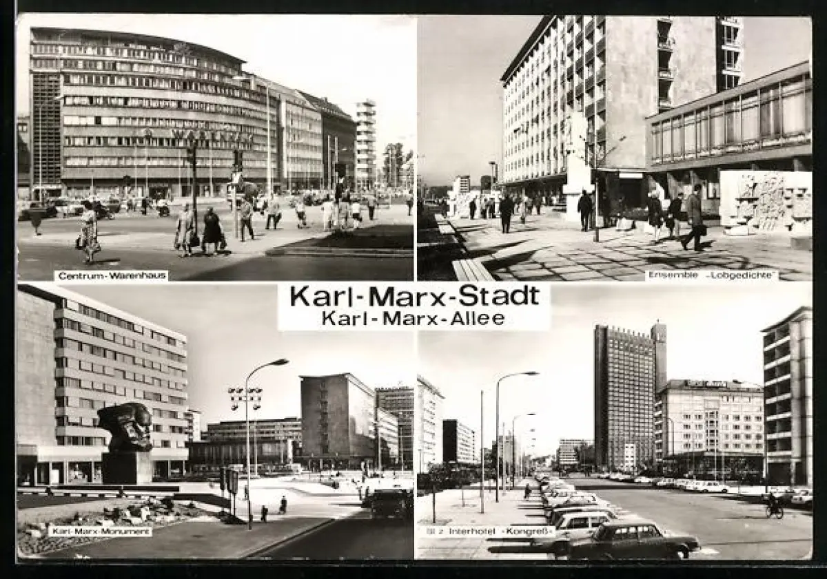AK Karl-Marx-Stadt, Karl-Marx-Allee, Centrum-Warenhaus, Ensemble Lobgedichte