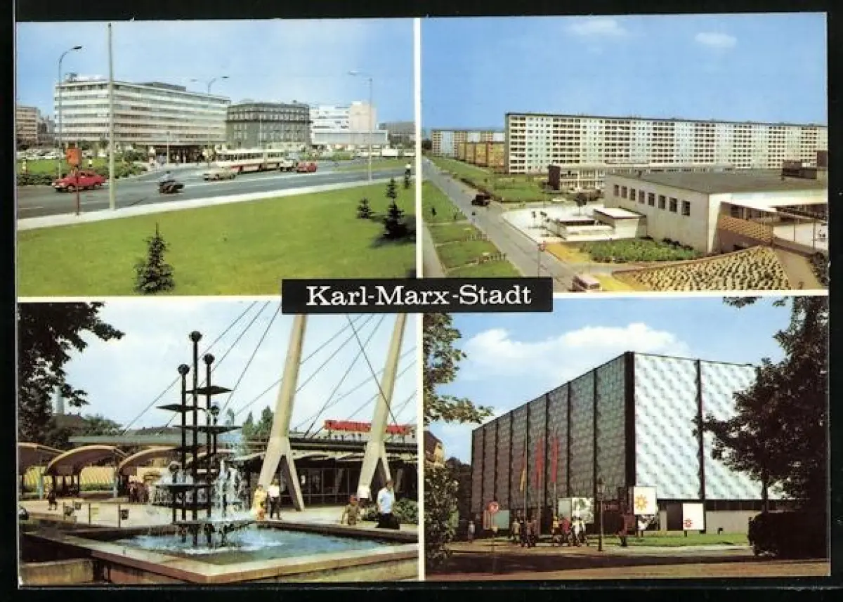 AK Karl-Marx-Stadt, Robotron - Zentrum für Forschung, Omnibusbahnhof, Ausstellungshalle am Schlossteich