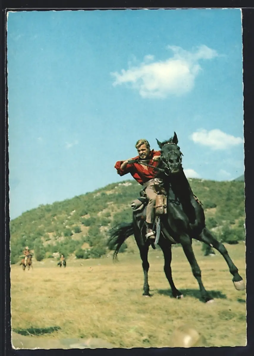 AK Karl May, Götz George in Der Schatz im Silbersee, Fred beim Aufbruch mit Pferd