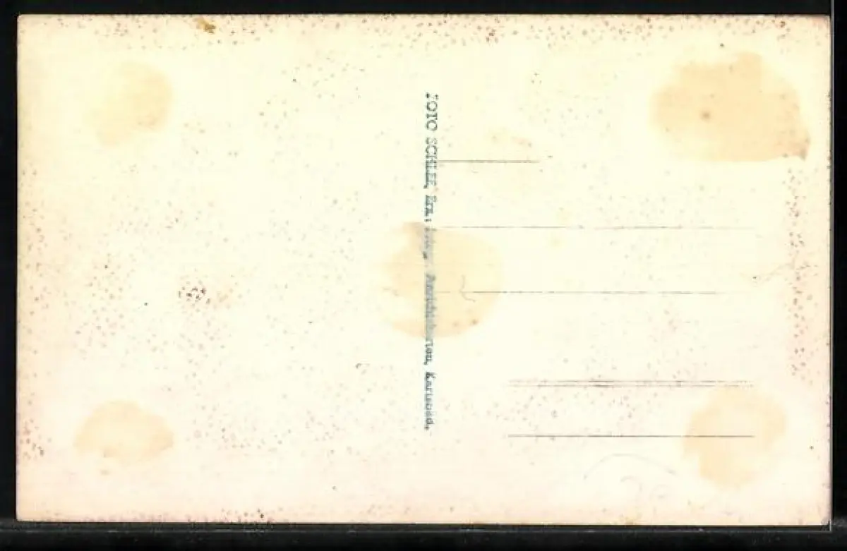 Personenbezogene Daten auf der Rückseite der Karte wurden durch blauen Textmarker unkenntlich gemacht. Die blauen Stellen sind auf die Vorderseite durchgeweicht und wirken sich negativ auf das Postkartenfoto aus