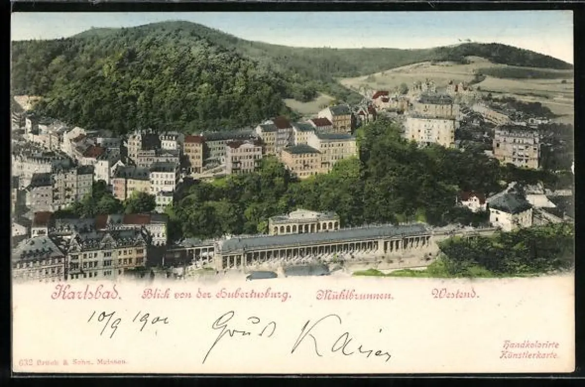 AK Karlsbad, Blick von der Hubertusburg mit Mühlbrunnen und Westend