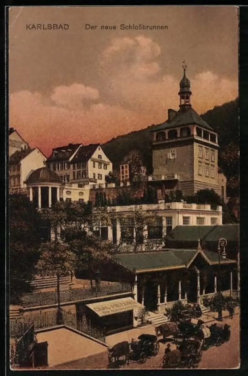 AK Karlsbad, Der neue Schlossbrunnen, Turmgebäude
