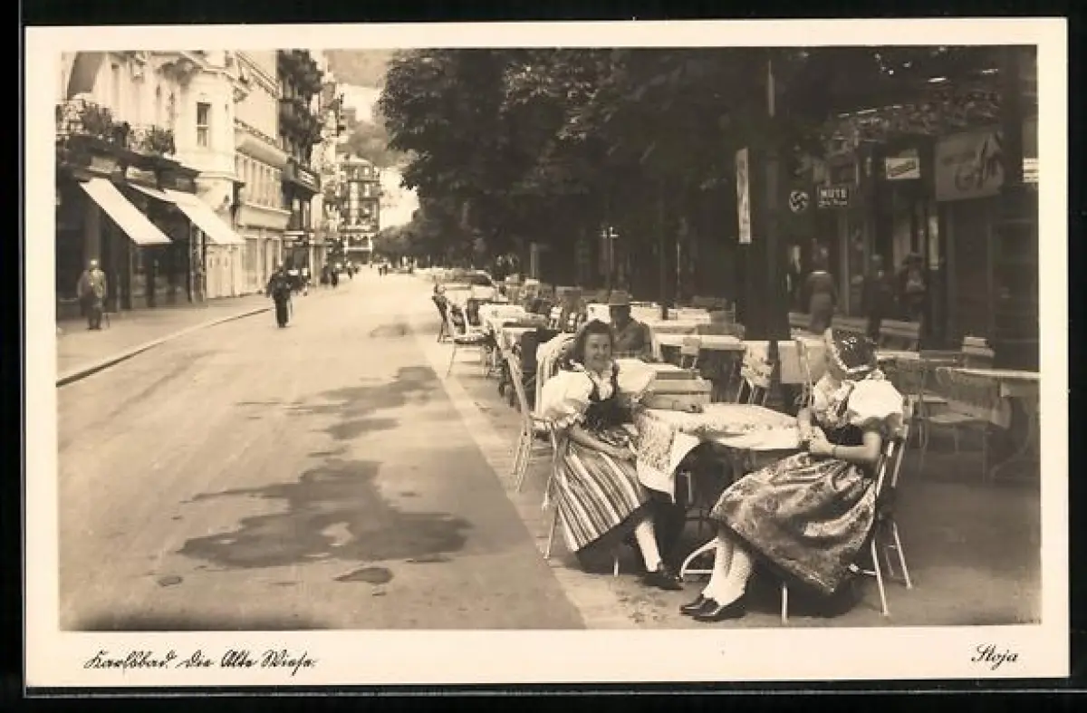 AK Karlsbad, Die Alte Wiese, Tische von Cafe am Strassenrand, -Fahne