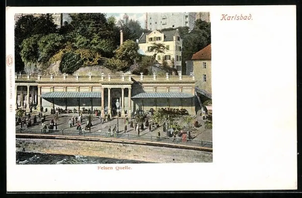 AK Karlsbad, Felsen Quelle mit Besuchern