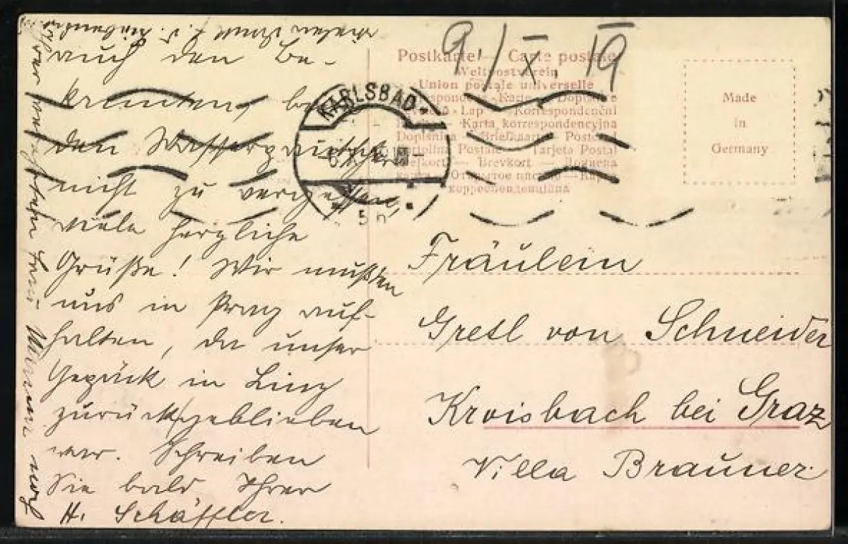 gelaufen 1919, Briefmarke entfernt, guter Zustand