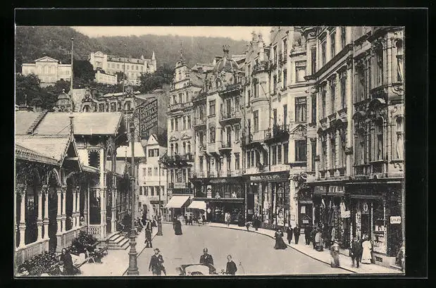 AK Karlsbad, Marktplatz mit Geschäftsfronten
