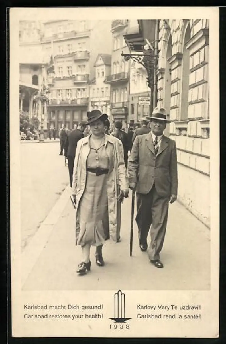 AK Karlsbad, Paar auf dem Bürgersteig 1938, Karlsbad macht dich gesund