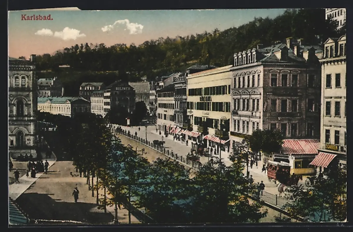 AK Karlsbad, Strassenpartie mit Geschäften u. Promenade aus der Vogelschau