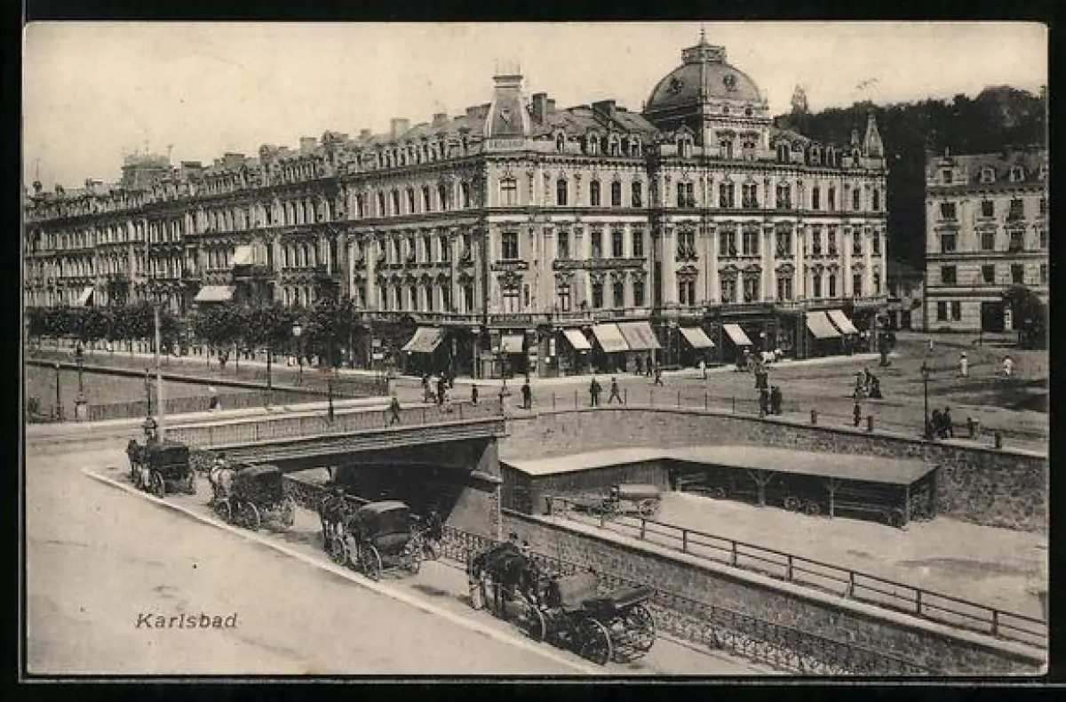 AK Karlsbad, Strassenpartie mit Kutschen