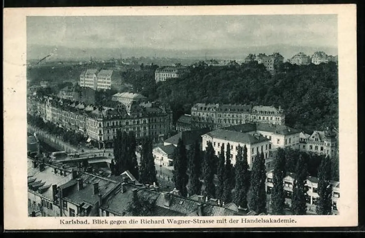 AK Karlsbad, Teilansicht mit Richard Wagner-Strasse und Handelsakademie