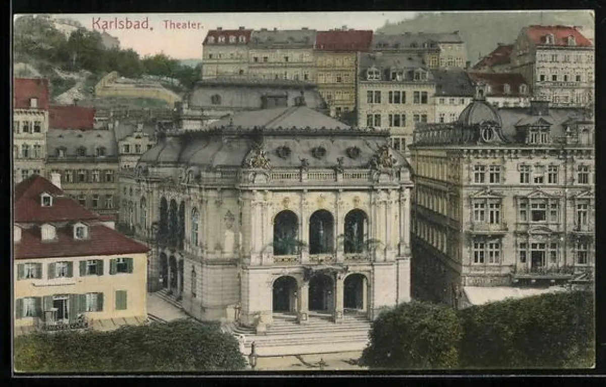 AK Karlsbad, Totalansicht des Theaters aus der Vogelschau