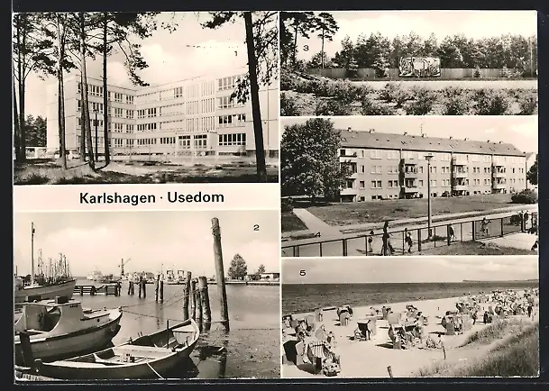 AK Karlshagen, VVN-Ehrenmal, Henrich Heine-Oberschule, Hafenpartie, Boote